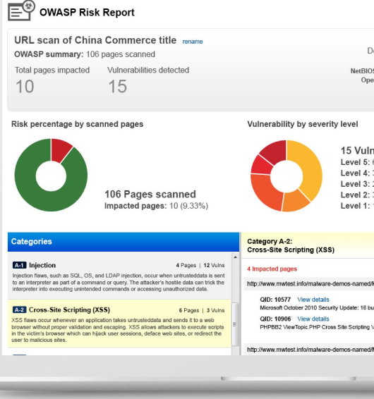 Robust cloud solution for continuous web app discovery and detection of vulnerabilities and misconfigurations. Fully cloud-based, it’s easy to deploy and manage, and scales to millions of assets. WAS finds and catalogs all web apps in your network, including new and unknown ones, and scales from a handful of apps to thousands. With Qualys WAS, you can tag your applications with your own labels and then use those labels to control reporting and limit access to scan data. WAS’ dynamic deep scanning covers all apps on your perimeter, in your internal environment and under active development, and even APIs that support your mobile devices. It also covers public cloud instances, and gives you instant visibility of vulnerabilities like SQLi and XSS. Authenticated, complex and progressive scans are supported. With programmatic scanning of SOAP and REST API services, WAS tests IoT services and APIs used by mobile apps and modern mobile architectures.