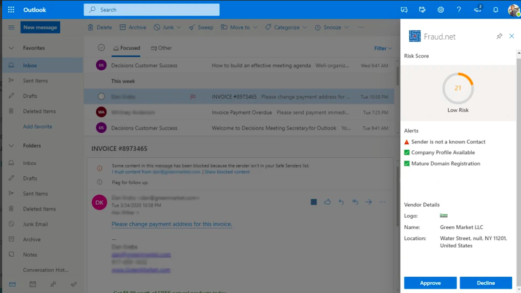Email Shield allows accounts payable (AP) agents to scan emails, AP senders, and attachments and approve, escalate, or reject payment and account change requests. The system accesses and modifies personal details in the active message including the subject, body, recipients, sender, and attachment information to ensure protection from invoice, vendor, and wire fraud.
