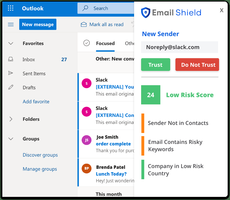 Email Shield is a cloud-based email security add-in, which helps businesses across various industry verticals such as banking, fintech, eCommerce, government, mobile, travel, gaming, telecommunications and more, prevent email-based fraud attempts and receive fraud risk scores and alerts. It tracks and verifies trusted contacts, letting users expose risky emails and ensuring safety of financial transactions.