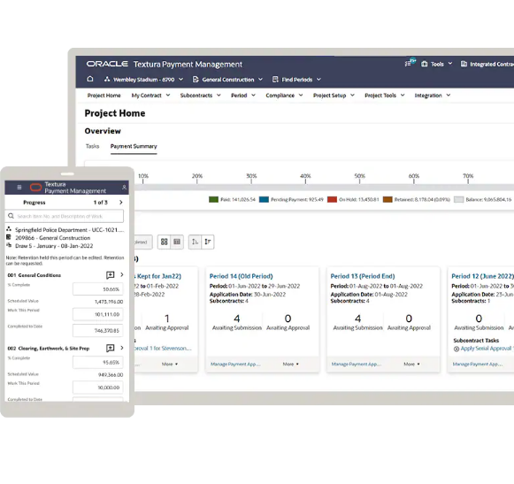 Progress claims, variations and payments don’t have to be admin heavy. Oracle Textura Payment Management is a market-leading cloud service, designed to bring every element of the process together into one secure and stress-free platform. By streamlining and automating your payments, for contractors and subcontractors alike, the platform enables you to cut out repetitive manual tasks and focus on improving your business. Oracle Textura users benefit from improved applications, payment scheduling, compliance management and disbursement. That means better control, efficiency and reduced risk for all project stakeholders. Oracle Textura gives you a 360° view of your digitized workflows, removing the chance for human error and ensuring compliance with Security of Payment regulations. It’s a modern, digital solution that offers construction organizations a painless end-to-end payments process, with full visibility and easy reporting for all relevant project stakeholders.