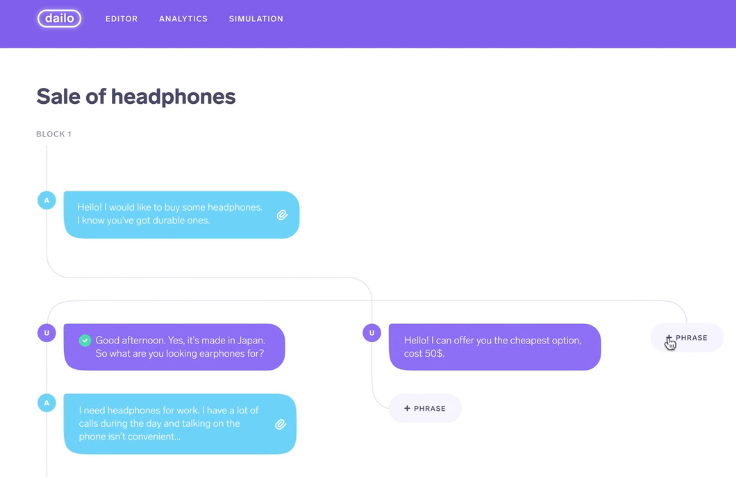 The first online dialogue platform to bring new knowledge through simulations. Anytime, anywhere. Create dialog simulations without writing a single line of code. Spread branching scenarios on mobile, desktop and even in VR-headset across team or learners, get outstanding results. Imagine launching an immersive learning experience that could be created by your own skill. Create unique speaking training simulation for your clients! Grow you NPS and clients satisfaction rate, get new revenue flow, be unique among competitors. Create unique speaking training simulation all your students are waiting for! Up-sale and/or get new clients thanks for unique offering. Create onboarding programs and courses to teach your employees. Created once allows you to be sure in your team and scale best practises fast. Prove your forward-thinking vision, save time, grow sales, structure your business processes.