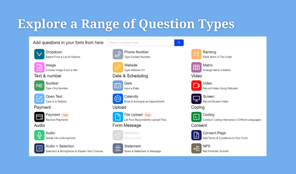 RapidoForm is your go-to solution for hassle-free, engaging forms that go beyond the usual data collection. Imagine creating forms that people actually enjoy filling out—thanks to features like audio and video responses, it's possible. And for tech-savvy needs, RapidoForm introduces a Coding Question type, allowing you to assess coding skills directly within the form, making it a game-changer for tech interviews.