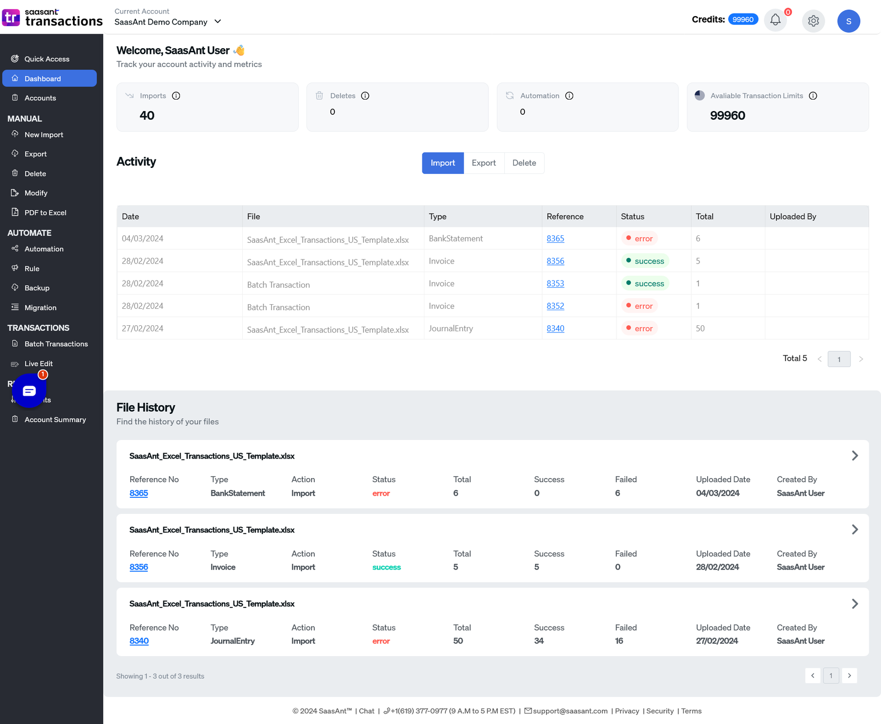 SaasAnt Transactions transforms the way you manage your accounting operations. Import, export, modify, delete, and migrate transactions effortlessly in QuickBooks and Xero from Excel files to overcome the manual data entry and tedious reconciliation processes in just a few clicks.