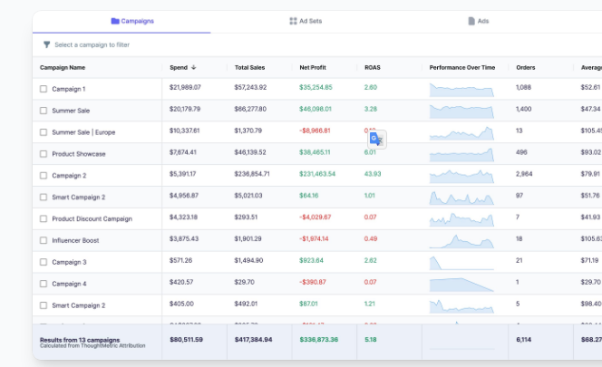 Ecommerce marketers use ThoughtMetric to track marketing performance and make data-driven decisions to scale revenue. ThoughtMetric integrates with the largest ecommerce and marketing platforms so you can easily connect data, track ads, and analyze performance. We help ecommerce companies understand the performance of their marketing and how to make data-driven decisions to improve it. We do this by combining siloed marketing data, complex customer journey data, and revenue attribution data to create a holistic and actionable picture of marketing performance. Find out where your customers are really coming from with ThoughtMetric's data-driven attribution modeling algorithms. Optimize your ads by scaling the campaigns that drive the most valuable customers to your store in terms of customer lifetime value. ThoughtMetric's advanced tracking will match sales back to the exact ad they came from.