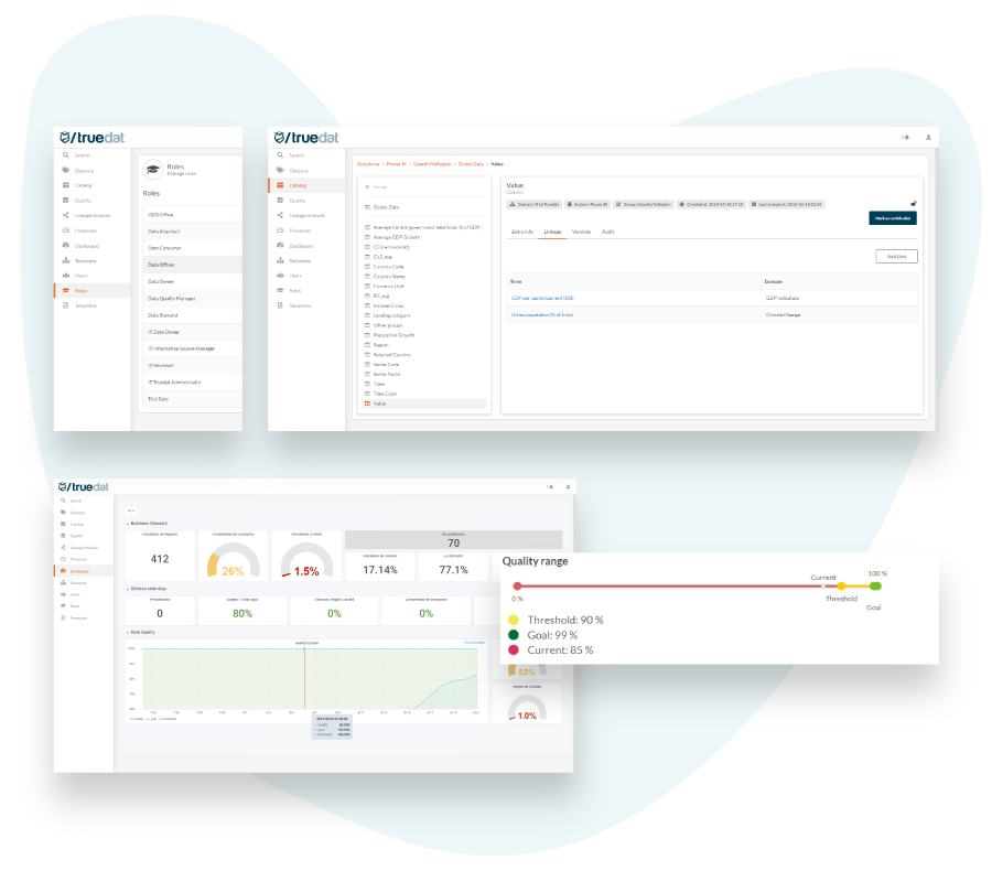 Truedat is an open source data governance business solution tool developed by Bluetab Solutions in order to help our clients become data-driven companies. We help to define business processes, roles & responsibilities. We also help putting processes into practice. Integration and customization of truedat´s open source components to support the data governance processes. We guarantee the support and maintenance of the process & software of our solution modules installed by us. Based on our experience in, we have developed a solution that covers the need for Data Governance, allowing to manage and control highly complex and changing data architectures. The highly increasing migration of enterprise IT platforms to cloud, multi-cloud and hybrid architectures, increases the sources, complexity and types of data and therefore rises the need for truedat. Our solution comes from more than 8 years of experience in Data Governance consulting and development projects.