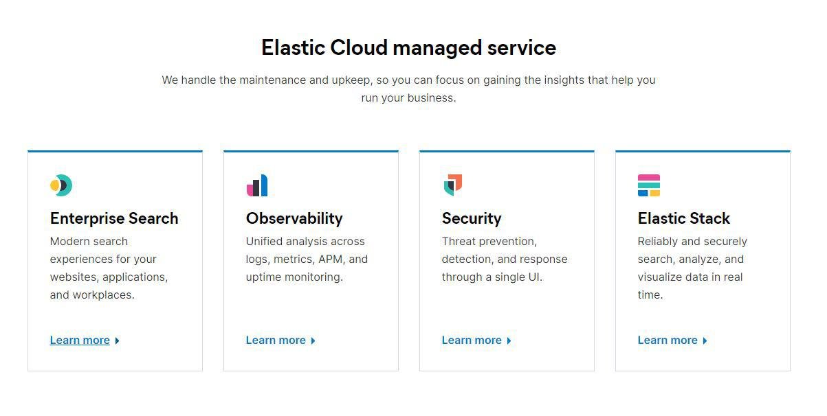 Enterprise search, observability, and security for the cloud. Quickly and easily find information, gain insights, and protect your technology investment whether you run on Amazon Web Services, Google Cloud, or Microsoft Azure. We handle the maintenance and upkeep, so you can focus on gaining the insights that help you run your business. Configuration and deployment are a breeze. Simple scaling, custom plugins, and architecture optimized for log and time series data are only a taste of what’s possible. Get the complete Elastic experience with features like machine learning, Canvas, APM, index lifecycle management, Elastic App Search, Elastic Workplace Search, and more — exclusively available here. Logging and metrics are just the start. Bring your diverse data together to address security, observability, and other critical use cases.