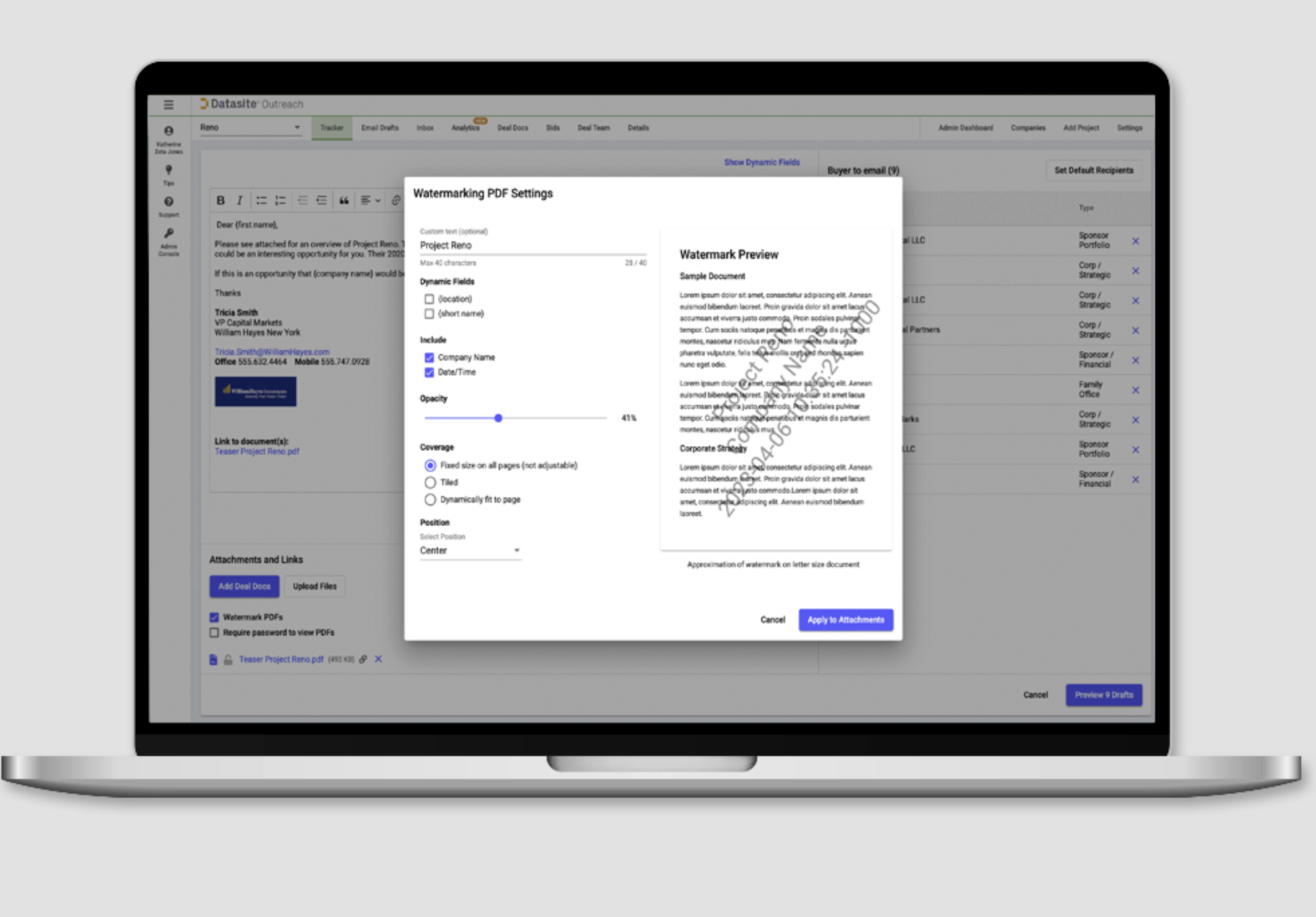 Just drag-and-drop from spreadsheets to import or update contact details of potential bidders, then track engagement across every opportunity. Reach hundreds of buyers as easily as one, create multiple emails from templates in moments, all watermarked and password protected, minimize errors and save days of work. Get updates in near-real time on buyer engagement and deal milestones. Export live data with one click, make decisions based on a single source of truth. Analyze buyer behavior across multiple opportunities to gain deeper strategic vision. Understand deal probabilities and market dynamics as never before. Plug Outreach into your customer relationship management (CRM) system for two-way data flow, seamless continuity, and maximum value from your CRM investment.
