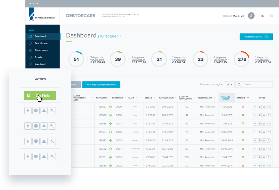 Debtorcare is a smart modular system that works from the cloud. The software can be linked from the cloud to your own accounting package. So there is no need to purchase custom software that needs to be installed on your own server. This makes a huge difference in costs. This makes the software interesting for small companies as well. Debtorcare - the first user-friendly credit management software. Debtorcare has been developed with this approach. First of all, this great software saves a lot of time. With the beautiful interface, credit management has never been so much fun to do. With a few mouse clicks you can bring up the correct overviews and you are in control. We are the first and only provider of user-friendly credit management software and we are proud of that. Debtorcare has been developed by credit management consultants who have years of experience in the credit management industry.