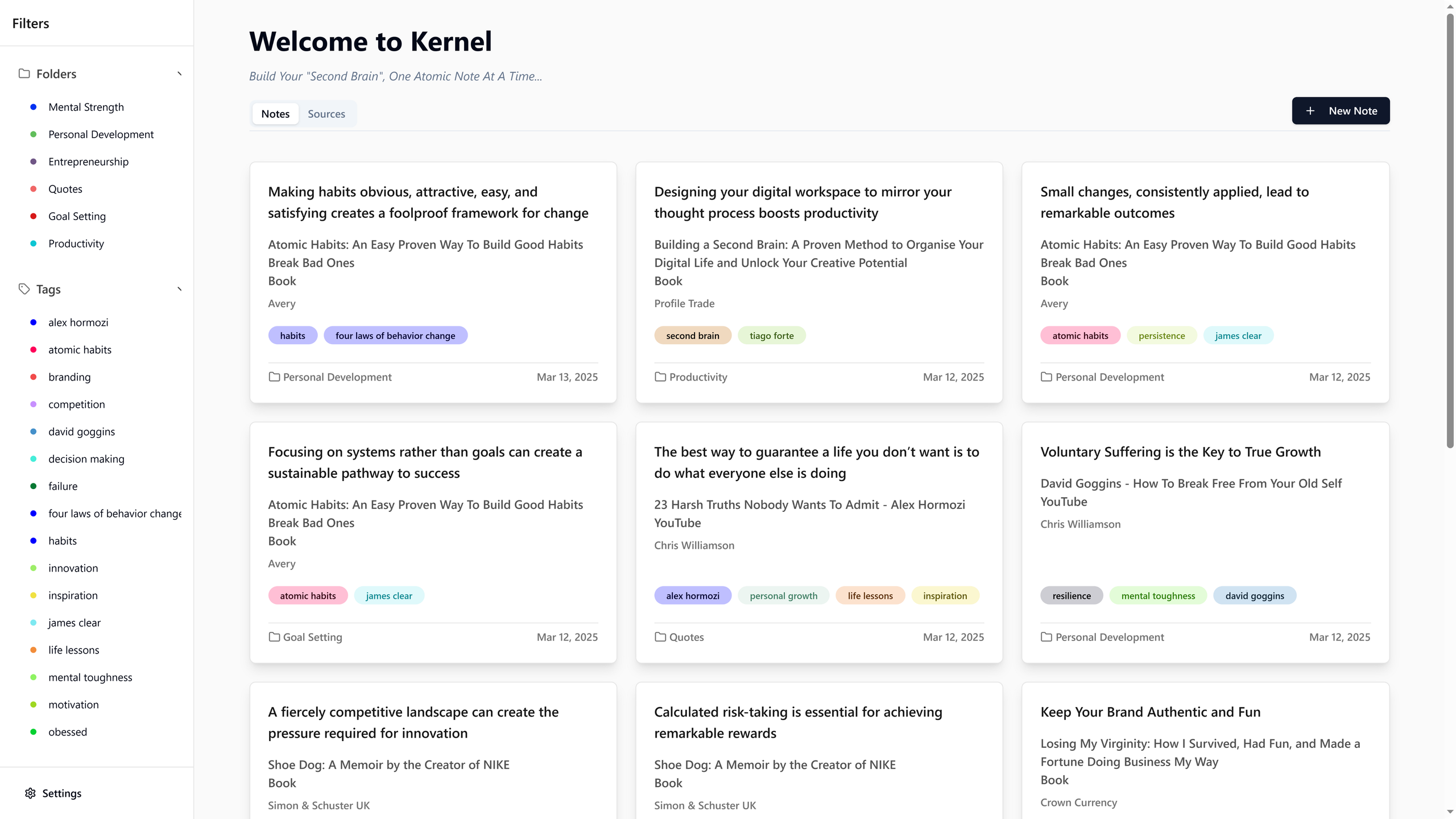 Kernel is a Software-as-a-Service (SaaS) application that lets you build your second brain one atomic note at a time. It is like your personal knowledge companion, designed for modern thinkers, learners, and doers. With Kernel you can effortlessly capture valuable insights from any source—books, podcasts, videos, and beyond—as clear atomic notes. Kernel then ensures your notes are linked by common attributes such as sources, folders and tags, enabling quick discovery of related knowledge, deepening insights and enhancing creativity. Its straightforward design and support for methods like PARA (Projects, Areas, Resources and Archives) make Kernel uniquely suited to people who want to enhance their learning and cultivate their own personal knowledge base.