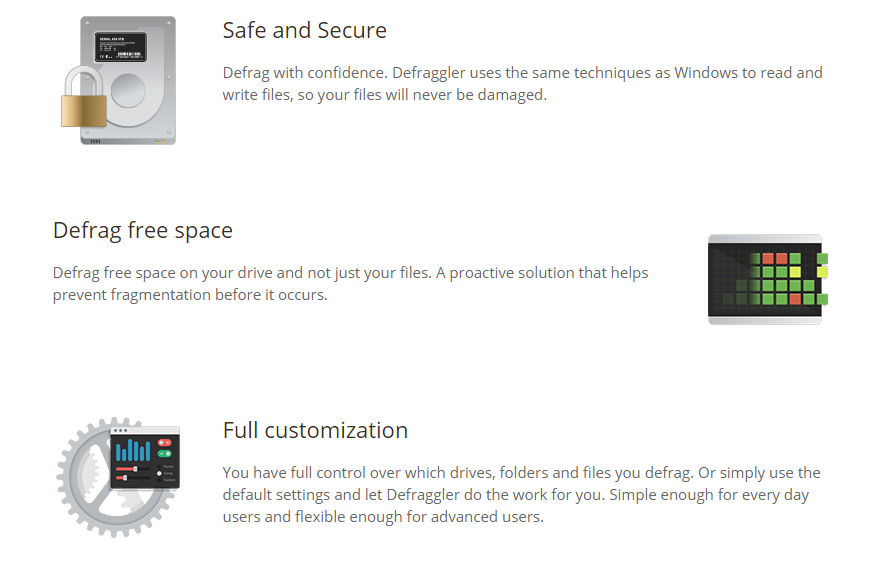 Defrag entire hard drives or individual files. Works with HDD and SSD and supports NTFS and FAT32 file systems! Defraggler speeds up your PC by assembling fragmented files on your machine and organizing them more efficiently. Defraggler does the hard work, so your computer doesn’t have to. Defrag with confidence. Defraggler uses the same techniques as Windows to read and write files, so your files will never be damaged. Defrag free space on your drive and not just your files. A proactive solution that helps prevent fragmentation before it occurs. You have full control over which drives, folders and files you defrag. Or simply use the default settings and let Defraggler do the work for you. Simple enough for every day users and flexible enough for advanced users. Defragment while you sleep, and wake up with a faster PC. Set Defraggler to run daily, weekly or monthly.