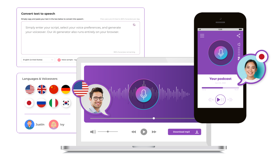 Designs.ai Speechmaker is an online A.I. voice generator to convert text into realistic voiceovers with A.I. in seconds. Convert script to natural-sounding voiceovers. Speechmaker is smarter, faster, and easier. Speechmaker uses advanced text-to-speech A.I. technology to generate natural-sounding voiceovers in seconds and at a fraction of the cost. Speechmaker uses artificial intelligence technology to analyze your script, generate a voiceover, and polish its tone and pitch. Engage an international audience with voices in multiple languages including English, French, Spanish, Mandarin, Korean and more. Enter your script, select your voice preferences, and generate your voiceover. Our A.I. generator runs entirely on your browser. Place your script into the text box and select a language and voice. Speechmaker analyzes your script and generates a realistic voiceover. All your voices are automatically saved. Simply preview and export for use.