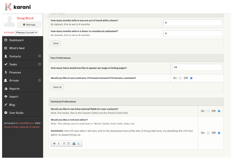 Stay organized, track your finances, and build better relationships using Karani. With Karani, it's easy to track your finances. Add or import your gifts and pledges with Karani so you always know where your funding is at. Fundraising is all about relationships. Use Karani to remember all the calls, asks, letters, thank you's, meetings, and interactions you've had with the people in your network. Spend less time figuring out what to do next. Keep your fundraising to-do's in Karani and say bye-bye to messy paper to-do lists forever. Store the contact information of your donors, prospects, and everyone else who matters in your fundraising. Since Karani lives in the cloud, you can access this information with an internet connection anytime, anywhere. The Karani support team is made up of former fundraisers who've experienced the pain, privilege, difficulty, and joy of fundraising. We know what fundraising is like and we know the ins and outs of Karani.