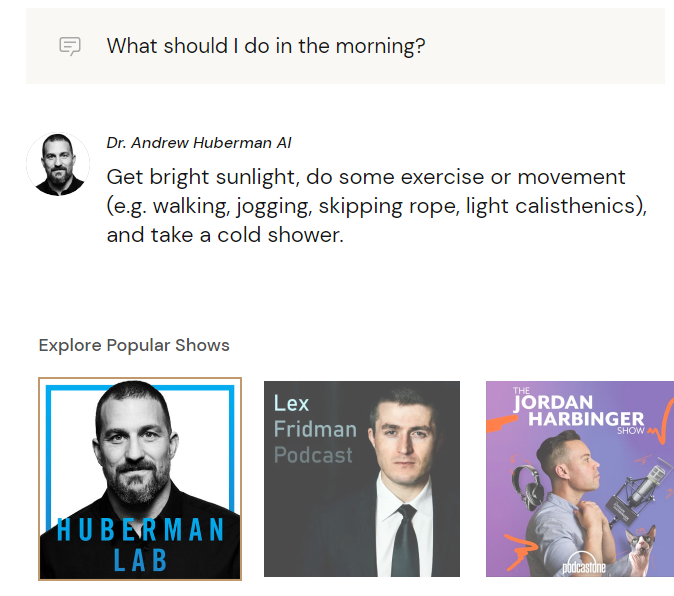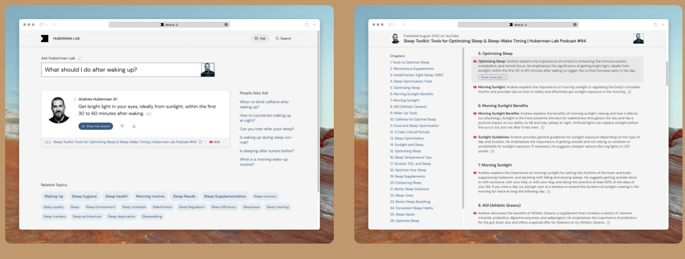 Explore, search, and ask questions using AI bots powered by your favorite podcasts. Pose questions to Dexa's AI assistants and receive tailored answers sourced directly from your favorite podcast episodes. Easily find relevant episodes by keyword, topic, or guest, broken down by digestible chapters. The Dexa network is a selective group of world-class creators. Trusted individuals with content archives that people are excited to discover, explore, and learn from. Dexa automatically ingests, indexes, and processes audio/video content to create a specialized AI assistant. We then host, maintain and update it for your audience to use. Give us your feed URL, and we'll handle the rest. There is a one-time set-up fee of $3/hour of audio for transcription, processing, and training the AI assistant.