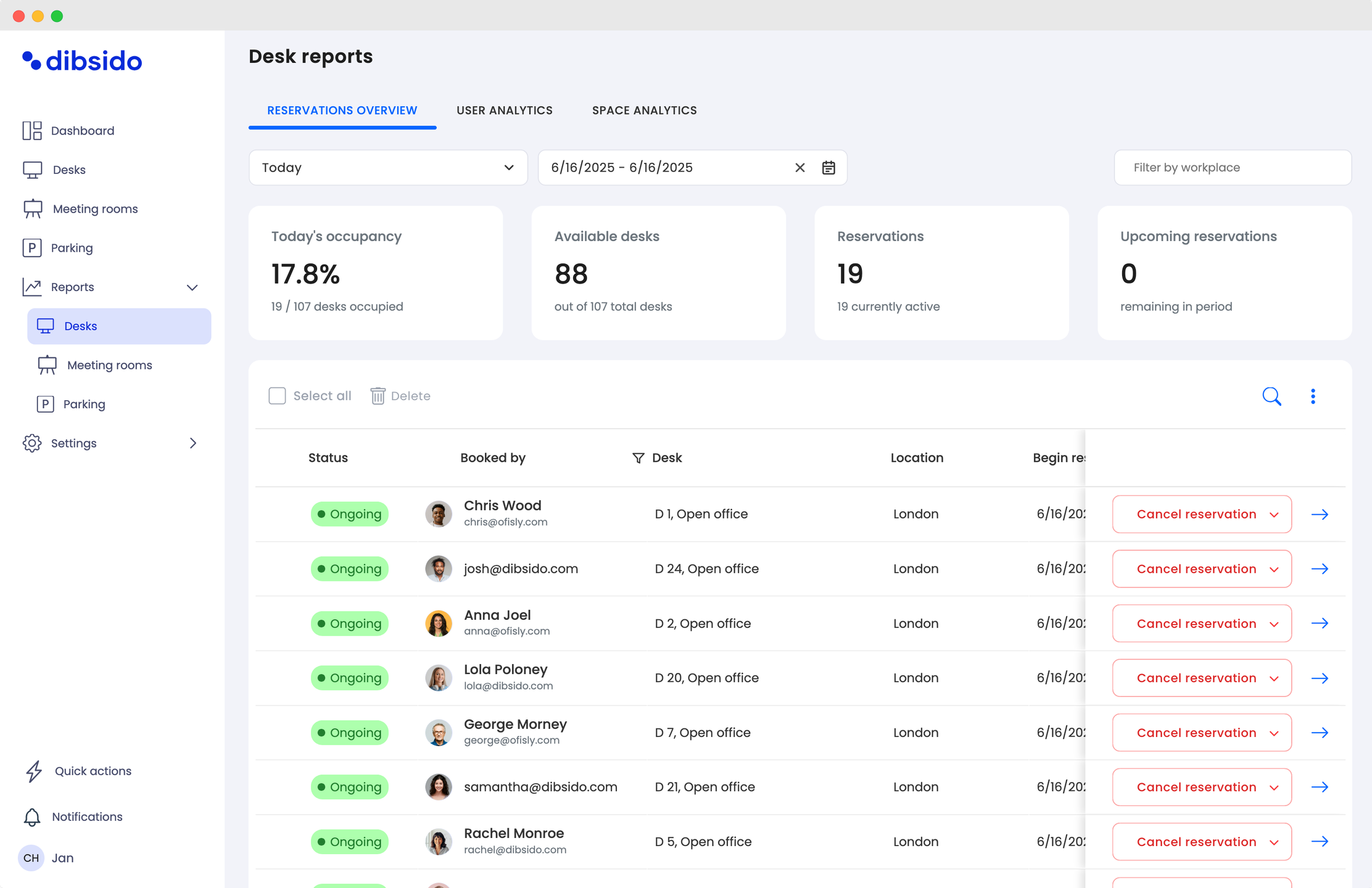 In addition to its intuitive booking system, Dibsido offers companies valuable insights into office space utilization. The built-in analytics mode tracks how many desks and parking spots are in use, helping you spot opportunities to reduce fixed costs and optimize the workspace.