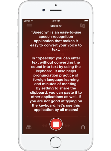 Speechy is an easy-to-use real-time dictation application based on the latest artificial intelligence and powerful speech recognition engine. In Speechy you can dictate the speech into text without the need for a keyboard to enter text. It also helps pronunciation practice of foreign language learning and minutes of meeting memo. Speechy not only transcribes your words, but also records your VOICE so you can refer to the original recording later! Plus, you can easily share your text and audio files later! (Works with Evernote, Dropbox, Google Drive, OneDrive, Facebook, Twitter, Snapchat, WhatsApp and other iOS supported sharing apps.) Whether you’re a professional writer, doctor, lawyer, disabled or somehow prevented from traditional typing, Speechy will swiftly solve your transcription problems and help you achieve your writing goals today! And Speechy doesn’t stop there! Speechy is global-focused, and will recognize your native language.