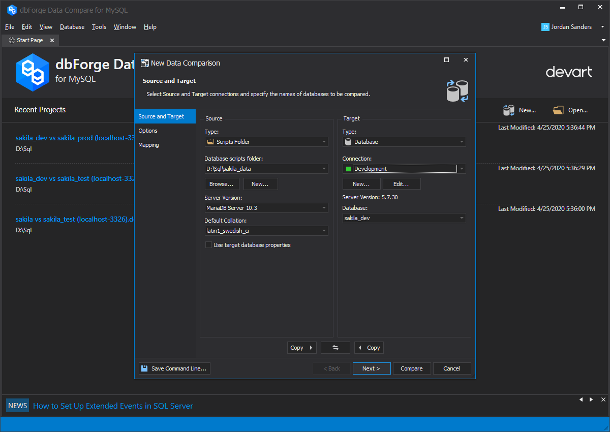 dbForge Data Compare for MySQL is a fast, easy-to-use tool to compare and synchronize data of MySQL, MariaDB and Percona databases. The tool provides clear view of differences between data, allows analyzing them, generates synchronization script and applies changes at a glance. It also allows scheduling regular MySQL data comparisons using command line.