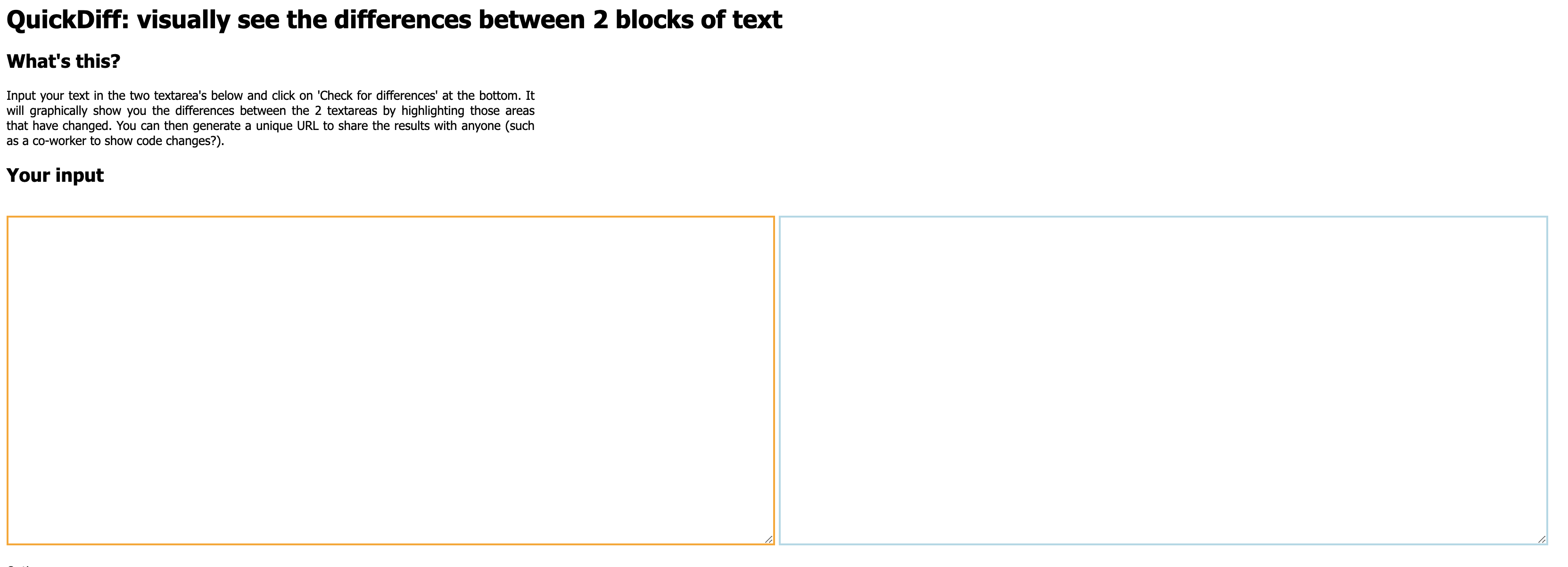 QuickDiff is a wrapper around the popular diff tool on Linux, designed to make viewing the changes between 2 blocks of texts more easy. This allows you to see the difference in text, lists, mails, and config files. It will graphically show you the differences between the 2 textareas by highlighting those areas that have changed. You can then generate a unique URL to share the results with anyone.