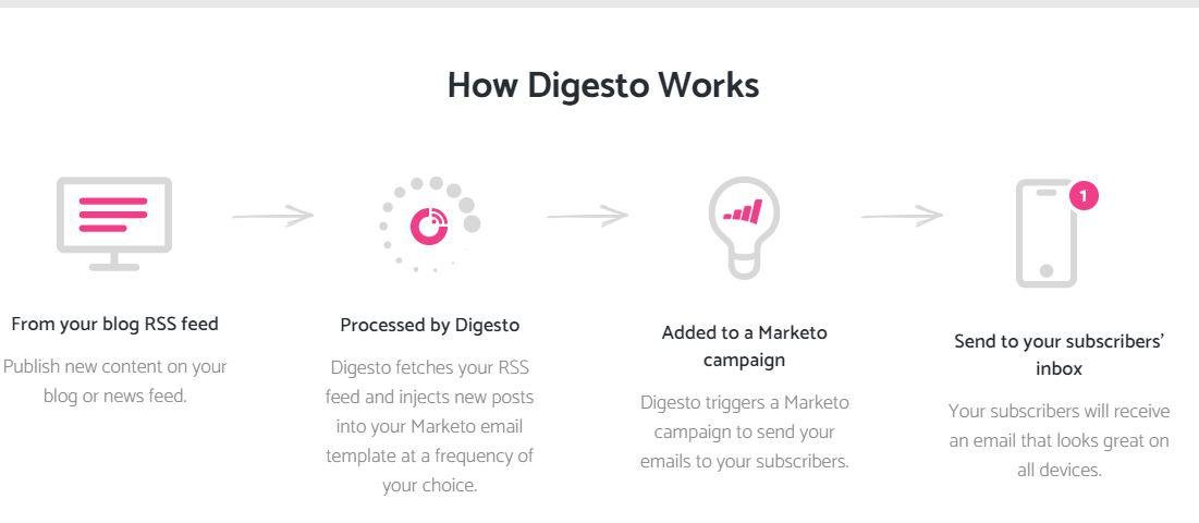 Use our 3 step guided setup instructions or let us do all the work for you! You’ll be off the ground in a blink. Digesto automates email campaigns or newsletter creation, saving multiple hours per week, and lets you turn your marketing into a well oiled content machine. Digesto’s seamless RSS-to-Email integration with Marketo lets you leverage your marketing automation platform as a centralized and unified place to nurture, convert, and report on your blog subscribers. Publish new content on your blog or news feed. Digesto fetches your RSS feed and injects new posts into your Marketo email template at a frequency of your choice. Digesto triggers a Marketo campaign to send your emails to your subscribers. Your subscribers will receive an email that looks great on all devices. Leverage your Marketo templates to build post email, blog newsletter or news feed in line with your branding or simply pick from our template library.