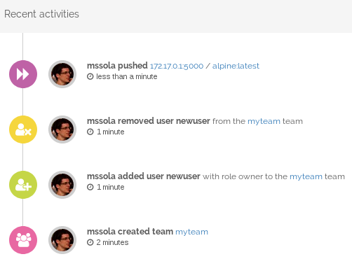 Portus implements the new authorization scheme defined by the latest version of the Docker registry. It allows for fine grained control over all of your images. You decide which users and teams are allowed to push or pull images. Map your company organization inside of Portus, define as many teams as you want and add and remove users from them. Portus provides an intuitive overview of the contents of your private registry. It also features a search capability to find images even faster. User privileges are constantly taken into account, even when browsing the contents of the repository or when performing searches. Keep everything under control. All the relevant events are automatically logged by Portus and are available for analysis by admin users. Non-admin users can also use this feature to keep up with relevant changes.
