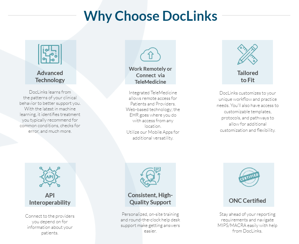 Spend less time entering frivolous data on patients and more time talking to them. DocLinks™ is a cloud based electronic medical record solution changing the way the healthcare industry captures, manages and centralizes patient medical records and streamlines the diagnostic and treatment processes. Through the powerful and fully integrated online modules, DocLinks™ provides the essential tools that enable healthcare professionals to fully automate their practices and to efficiently and securely connect with hospitals, diagnostic imaging centers, pharmacies, laboratories, peers, and patients. DocLinks learns from the patterns of your clinical behavior to better support you. With the latest in machine learning, it identifies treatment you typically recommend for common conditions, checks for error, and much more. Integrated TeleMedicine allows remote access for Patients and Providers. Web-based technology; the EHR goes where you do with access from any location.