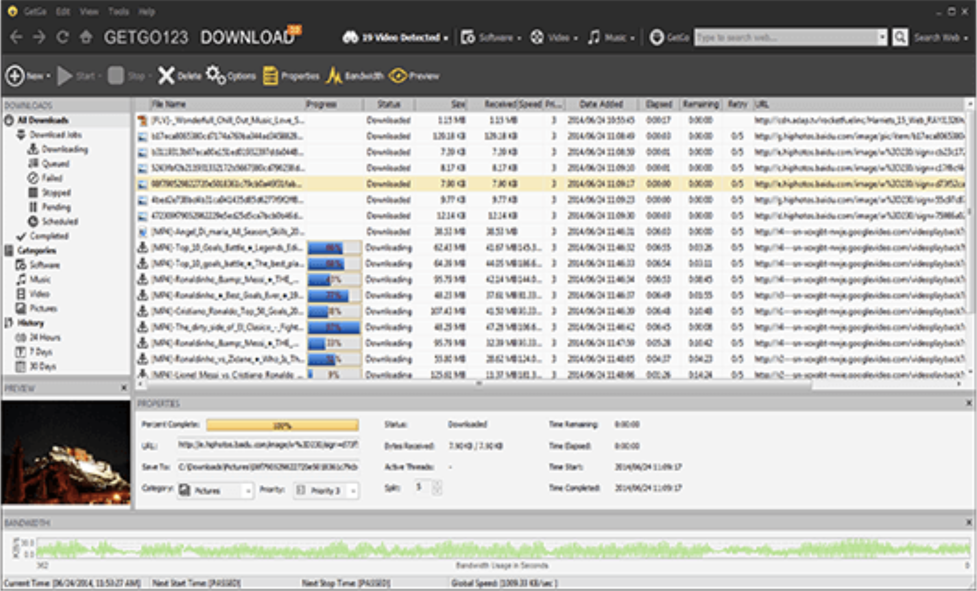 Integrated web browser (GetGo 123) detects web videos using our cloud-based technology for you to download and save to local disk. Smart download engine intelligently segments the file using multiple threads to accelerate your download. Comprehensive error recovery and resume capability can restart broken or interrupted downloads due to lost connections, network problems, computer shutdowns, or unexpected power outages. You can easily set up a Batch Download that not only downloads a large list of files using an URL pattern template, but also automatically renames downloaded files using a filename pattern template.