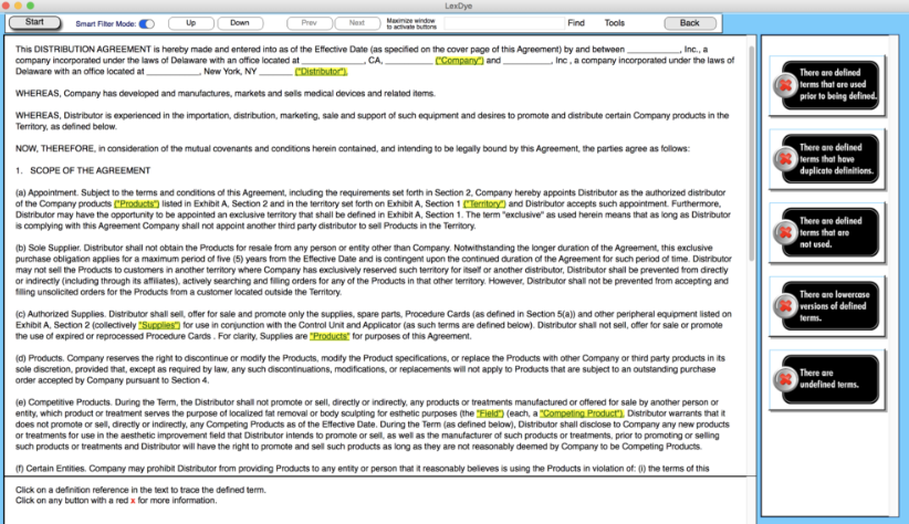 LexDye develops analytical tools, not word processing tools, that enable attorneys and other professionals to gain an in-depth understanding of contracts during the drafting process. Our tools "dye" the text of a document to reveal potential drafting errors and to ensure that the draft reflects the contract as intended by the drafter. The LexDye Definition Tracker installs locally on the user's computer behind any firewall or on a virtual desktop. It analyzes documents only locally and does not store any documents. Your drafts are kept safe and confidential on your systems. Our software does not need any cloud access or Internet connection! We recognize that software cannot replace the drafter, especially when it comes to complex legal documents. Instead, our tools aim to aid the drafting process by giving you new insights not available with the word processing tools used in conventional contract drafting.