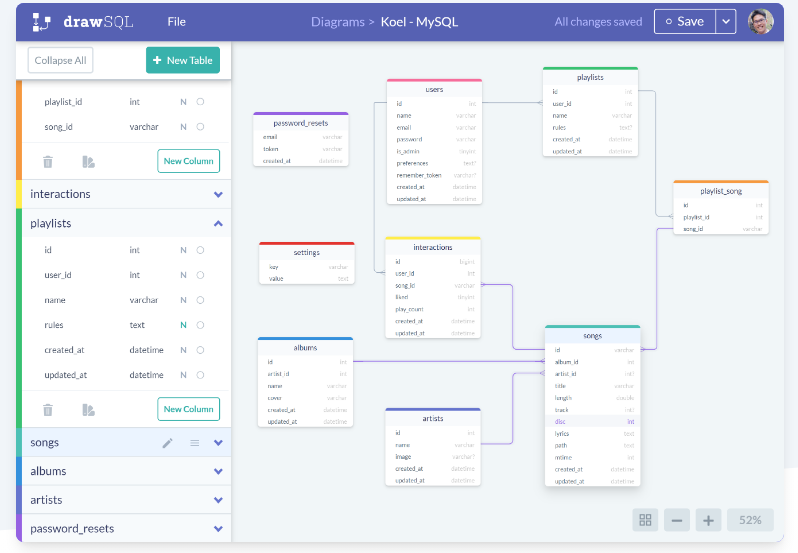 With DrawSQL you can design, visualize, and collaborate on entity relationship diagrams for your databases. Easily visualize your database schema and see how everything fits together. Having a living document of your app schema helps when architecting a new feature or onboarding a new team member. Invite your teammates to collaborate on your database diagrams. With drawSQL as a single source of truth, no need to manually sync diagram files between different developers and offline tools anymore. Create professional diagrams that stand out. Unlike other database clients, drawSQL's editor is easy to use, looks nice, and focuses on helping you visualize your database schemas without being bloated with other database management features. Create a diagram for your app database in less than 15 minutes. Work together to design, model, and document the database schema of your app. Provides diagram versioning and access controls.