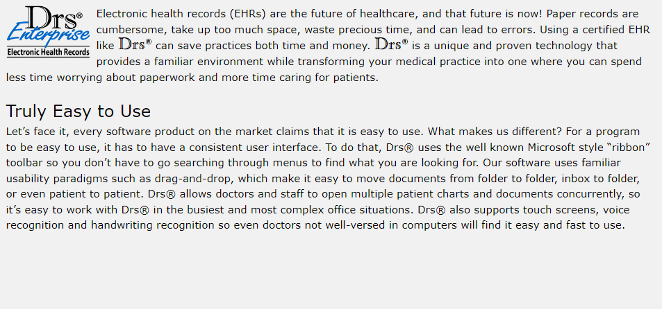 Paper records are cumbersome – they take up space, waste precious time, and can lead to errors. Using an Electronic Health Record (EHR) like Drs® Enterprise means bypassing the time it previously took to create, find, pull, and store paper charts – leaving you more time to care for patients. Unlike other EHRs, Drs® Enterprise uses easily customizable templates that can be perfectly suited to the needs of your practice and are easy enough for everyone to use. Drs® Enterprise is Meaningful Use II certified. It meets all government criteria for a modern medical practice, so you won’t have to worry about getting the promised benefits for the crossover from paper to digital records.