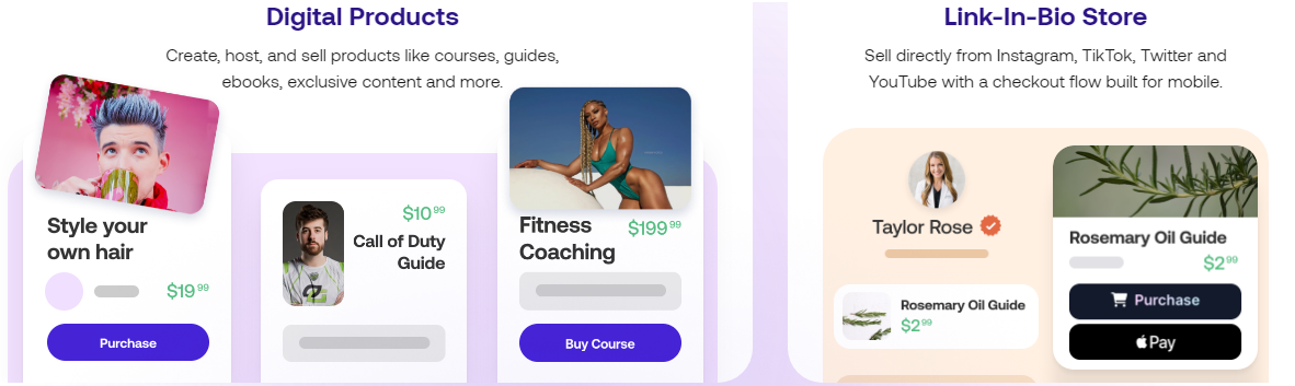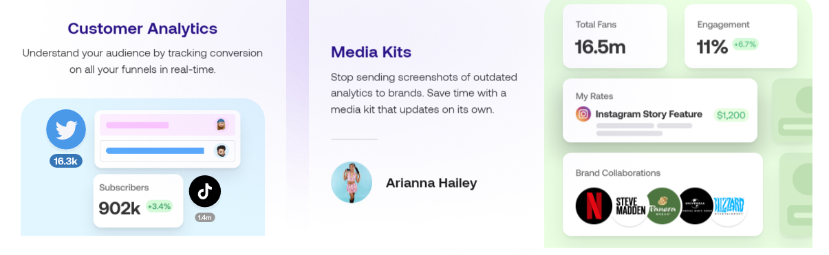 Sell digital products your followers will love with AI-powered checkout. Close brand deals with your own auto-updating media kit and start your new creator business today. Create, host, and sell products like courses, guides, ebooks, exclusive content, and more. Sell directly from Instagram, TikTok, Twitter, and YouTube with a checkout flow built for mobile. Understand your audience by tracking conversion on all your funnels in real time. Stop sending screenshots of outdated analytics to brands. Save time with a media kit that updates on its own. Turn followers into customers with our AI-powered checkout flow, now featuring Apple Pay, for a seamless and secure checkout flow. Let our media kits do the pitching & give brands an easy way to reach out in just a few taps. Our real-time data helps you understand your audience across all your platforms in one simple dashboard. Stop paying for dozens of log-ins and start doing everything from our all-in-one platform.