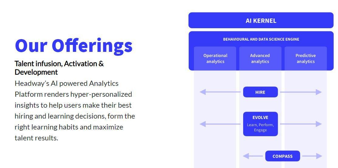 A smart talent platform blending AI and behavioural science to power Enterprise Talent Acquisition, Talent Management and Development with analytics & smart-bots to deliver big bang talent outcomes. Unified talent suite creating a democratised work eco-system for people to thrive & excel. Nudge network powered by behavioural science to propel action and smart decisions. Real time, visual dashboards to help leaders and managers take the right people decisions, at the right time. Drudgebots freeup user’s time to focus on what matters the most. Who says enterprise softwares cannot be useful, delightful and humane? Complex purposeful AI technologies blended in a seamless and invisible way. Headway’s AI powered Analytics Platform renders hyper-personalized insights to help users make their best hiring and learning decisions, form the right learning habits and maximize talent results.