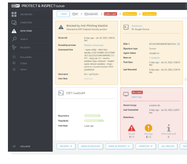 Endpoint Detection and Response tool from ESET that enables continuous comprehensive monitoring of real-time endpoint activity, in-depth analysis of suspicious processes and immediate response to incidents and breaches. Paired with ESET Endpoint Protection Platform, ESET Enterprise Inspector is a complete prevention, detection and remediation solution. ESET Enterprise Inspector features an API that enables accessing and exporting of detections and their remediation to allow effective integration with tools such as SIEM, SOAR, ticketing tools and many others. ESET Enterprise Inspector features remote PowerShell capabilities that allow security engineers to remotely inspect and configure their organization’s computers, so a sophisticated response can be achieved without breaking the user’s workflow. Apply data filters to sort it based on file popularity, reputation, digital signature, behavior or contextual information.