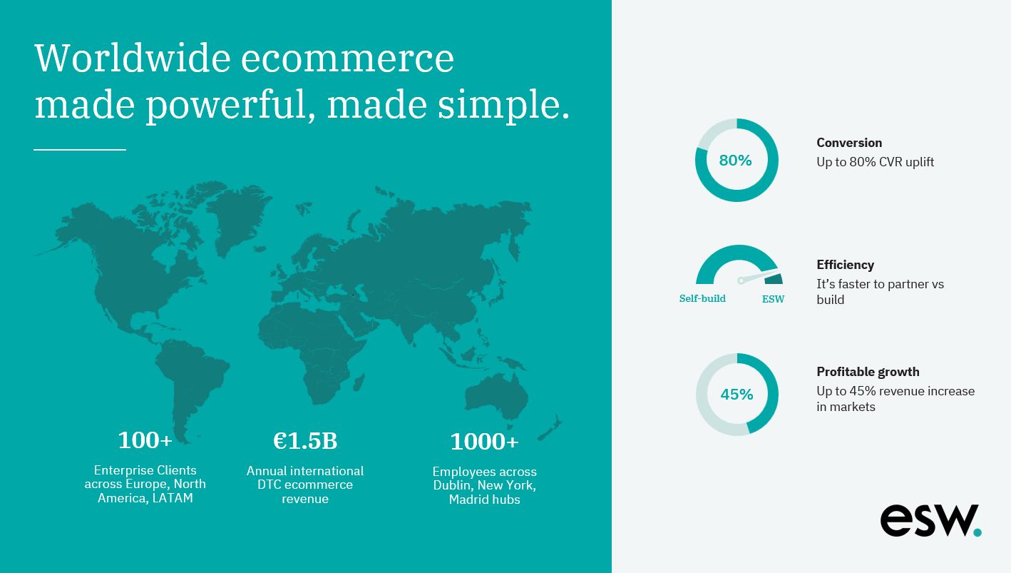 ESW makes worldwide ecommerce powerful and simple. We offer the world’s best-loved brands solutions that reduce cross-border complexity and create moments that matter between them and their shoppers. We focus on localising the online shopping experience to increase conversions and loyalty while also taking on the complications of doing business in international markets. We do it through frictionless checkouts, fast, reliable shipping and returns and by reducing compliance and regulatory risk. All while coming alongside our clients