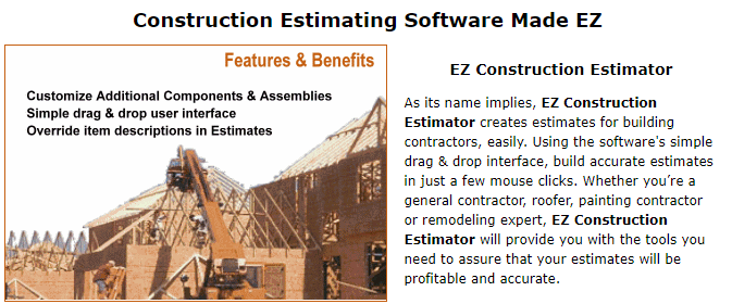 As its name implies, EZ Construction Estimator creates estimates for building contractors, easily. Using the software's simple drag & drop interface, build accurate estimates in just a few mouse clicks. Whether you’re a general contractor, roofer, painting contractor or remodeling expert, EZ Construction Estimator will provide you with the tools you need to assure that your estimates will be profitable and accurate. EZ Construction Estimator is installed with a database of over 2000 Components and Assemblies. Build your own Components and Assemblies to supplement those installed. Attach pictures, blueprints, etc. to Estimates and print pictures on reports. Automatically calculates floor area, wall areas and wall lengths. Over a dozen reports installed with the software including Scope of Work and several Contract types. EZ Report Tool creates custom reports to supplement those installed with the software.