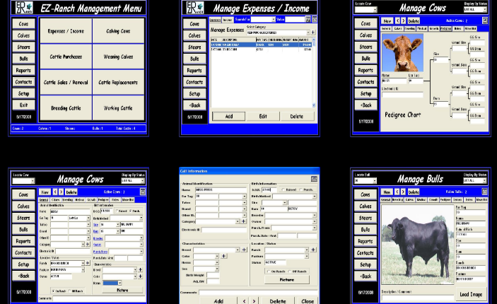 Track All ranch farm expenditures and income received for custom categories designed by you. Create professional itemized reports for tax preparation and filing. Use the search features to view or print any receipt or check number instantly. All reports can be generated monthly, quarterly, or annually by using the “Date Range” print menu. This allows multiple years of data to be stored for year-to-year comparison. Breed an animal “Natural, Artificially, or Embryo Transfer”. You can also “Turn In” or “Remove” a bull from a group of cattle. Easily Add a Cow, Calf, Steer or Bull by clicking this button. This feature will automatically “Add” a new animal and await you to enter all related information. Calve an individual or group of cattle all from one screen. Wean an individual or group or cattle all from one screen. Promote an individual or group of calves to a “Cow”, “Steer”, or “Bull” all from one screen.