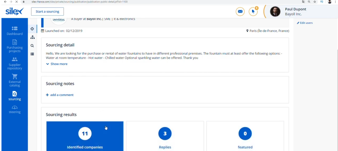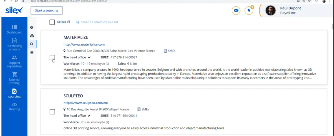 Silex is the first cognitive sourcing platform that helps buyers and procurement leaders to streamline all their sourcing & supplier processes. By using data and best-in-class AI algorithms, Silex brings procurement performance to the next level. Scouting functionalities are intended to strengthen the ability of buyers to know and master supplier markets. Users identify, evaluate, exchange and compare suppliers on a comfortable, efficient and easy-to-use solution. With assistive technologies and natural language searches, users work efficiently and can conduct more procedures while integrating even more precise constraints and criteria. Silex offers the possibility of integrating repositories (suppliers, contracts) to harmonize purchasing practices and share knowledge within the organization. In addition, Silex offers its users to access essential data sources (public and private) guaranteeing the analysis of relevant and up-to-date information on all suppliers.
