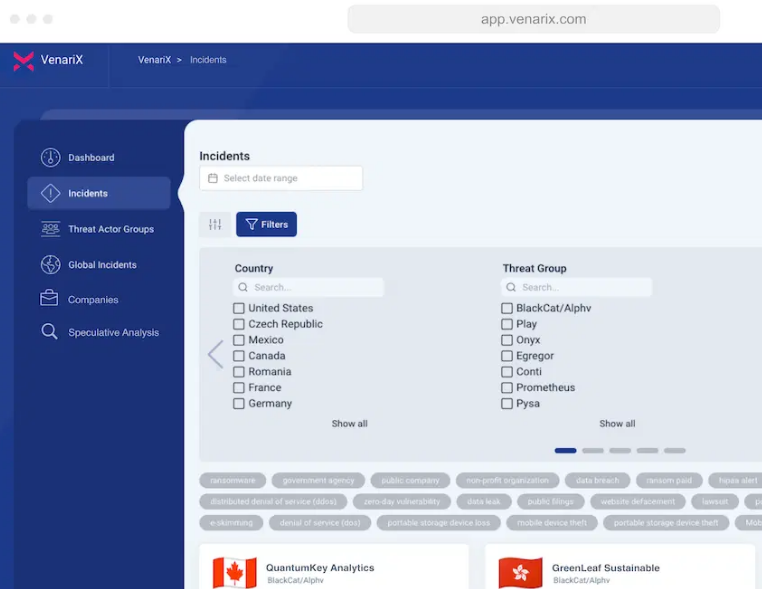 Discover your real exposure to cyber threats with VenariX, a data-driven, uncomplicated, and affordable platform that makes cyber insights accessible to everyone. Gain the foresight and knowledge to enhance your cyber resilience effectively. Customize and export your cyber insights dashboard for a tailored view of charts, graphs, and key stats, enhancing decision-making and reporting. Sort and analyze an exhaustive inventory of cyber incidents with detailed, time-based filters across various categories, enabling proactive measures and strategic planning. Track threat actors’ behaviors and patterns, equipping your team with the knowledge to anticipate and mitigate cyber risks. Visualize global incidents' origins and impacts, facilitating a better understanding of the cyber threat landscape and enhancing your global cyber defense strategies. VenariX delivers cyber clarity, transforming complex threats into actionable insight for decisive, meaningful action.