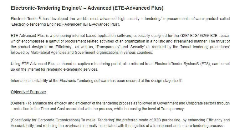 ElectronicTender® has developed the world's most advanced high-security e-tendering/ e-procurement software product called ‘Electronic-Tendering Engine® - Advanced’ (ETE-Advanced Plus). ETE-Advanced Plus is a pioneering internet-based application software, especially designed for the G2B/ B2G/ G2G/ B2B space, which encompasses a gamut of procurement related activities of an organization in a holistic and streamlined manner. The thrust of the product design is on ‘Efficiency’, as well as, ‘Transparency’ and ‘Security’ as required by the ‘formal tendering procedures’ followed by Multi-lateral Agencies and Government organizations in various countries. Using ETE-Advanced Plus, a shared or captive e-tendering portal, also referred to as ElectronicTender System® (ETS), can be set up on the internet for rendering e-tendering services. International suitability of the Electronic Tendering software has been ensured at the design stage itself.