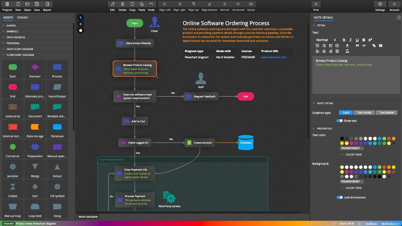 Designed for analysts, developers, students and system designers, Merit Modeler helps you visualize processes, document software systems and communicate ideas clearly. Because it runs locally on your computer, it is fast, secure and fully available offline - no subscriptions, no online accounts.