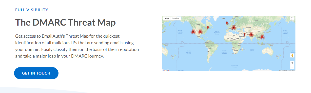 It is an anti-spoofing, anti-impersonation, and anti-phishing platform that ensures that no one can abuse your domains online. If anyone in the world spoofs your domains, EmailAuth collates data from all across the world to ensure that even a single unauthorized email is caught and rejected by global recipients of the world. It even extracts the IP of the sender, so this threat intelligence can be used to block the attacker across your cyber security fabric