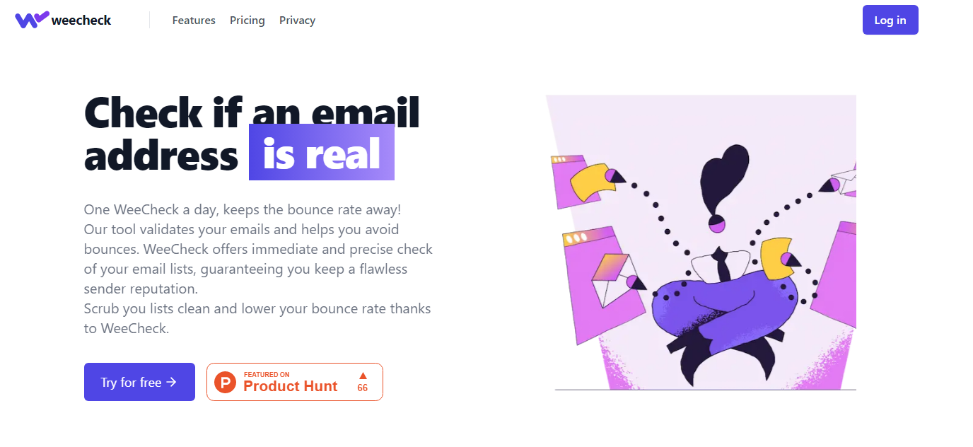 WeeCheck a day, keeps the bounce rate away! Our tool validates your emails and helps you avoid bounces. WeeCheck offers immediate and precise check of your email lists, guaranteeing you keep a flawless sender reputation. Scrub you lists clean and lower your bounce rate thanks to WeeCheck. Add value to your data with Weecheck, connect with real people and get better results.