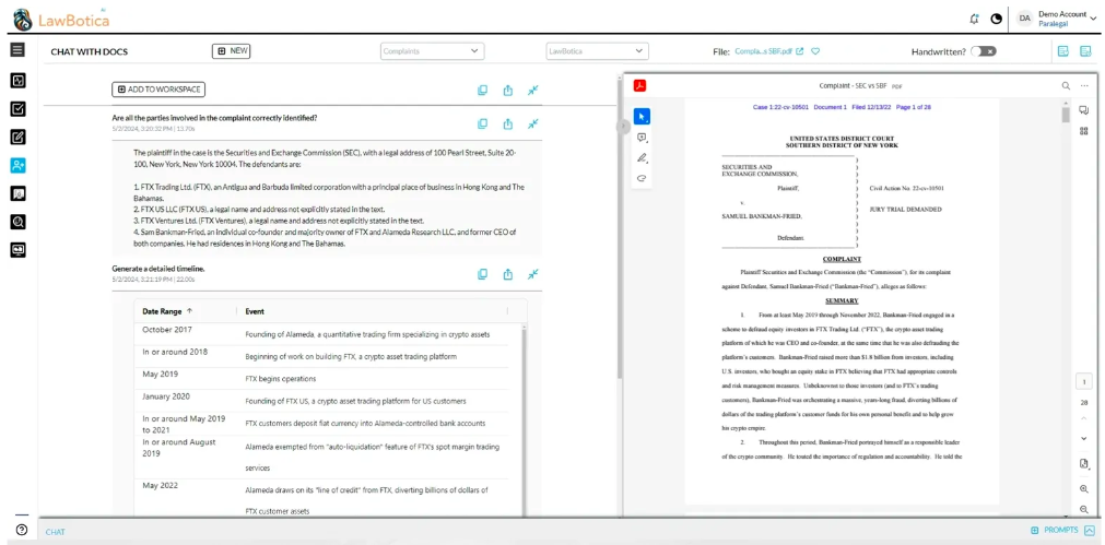 LawBotica transforms legal practice by automating deposition summaries, crafting case timelines, and offering comprehensive due diligence, document review, interactive chats, and collaborative workspaces—turning months of work into minutes of efficiency. Empower your legal team with our AI-powered Document Review module, built on a custom Legal Language Model tailored for the legal industry. Upload your legal documents to receive detailed analysis, critical insights, and practical recommendations. Streamline your review process and make informed decisions faster. Our Document Summarization module, built with a custom Legal Language Model, offers a quick and efficient way to digest complex legal documents. Whether it's court opinions, testimonies, or depositions, our tool provides clear, concise summaries that save you time and enhance your understanding. Unlock the potential of your legal documents with our Document Chat module.