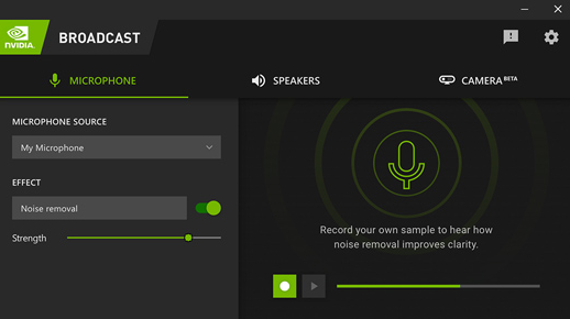 The NVIDIA Broadcast app transforms any room into a home studio. Take your live streams, voice chats, and video conference calls to the next level with AI-enhanced voice and video. Get a taste of what the Broadcast app can do for you using the incredible performance of NVIDIA® RTX GPUs. Loud keyboard typing, annoying microphone static, bothersome PC fans, nagging background reverb. Noise removal and room echo removal use AI to eliminate unwanted background noise at the touch of a button. Go live or attend a meeting remotely without worrying about finding a quiet place. Or mute players in loud environments, making them easier to understand. NVIDIA Broadcast makes it fast and easy. Customize your background without the need for expensive equipment or complex lighting setups. Personalize your webcam feed using powerful AI greenscreen effects perfect for work and play, wherever you are. The possibilities are endless.