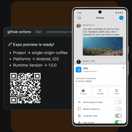 Expo is an open source platform that enables developers to create universal native apps using React,.It offers a comprehensive ecosystem of tools and services designed to streamline the development, review, and deployment processes. With Expo, developers can initialize new projects or integrate existing React Native projects, utilizing features like file-based routing and TypeScript support to build stack and modal screens with minimal boilerplate. It provides fast refresh capabilities, allowing real-time updates on devices through the Expo Go app. Developers have the flexibility to use any library, SDK, or write custom native code, ensuring no limitations in accessing device APIs. Expo facilitates team collaboration by enabling role-based access, QR code generation for feature previews, and integration with GitHub for streamlined pull request reviews.