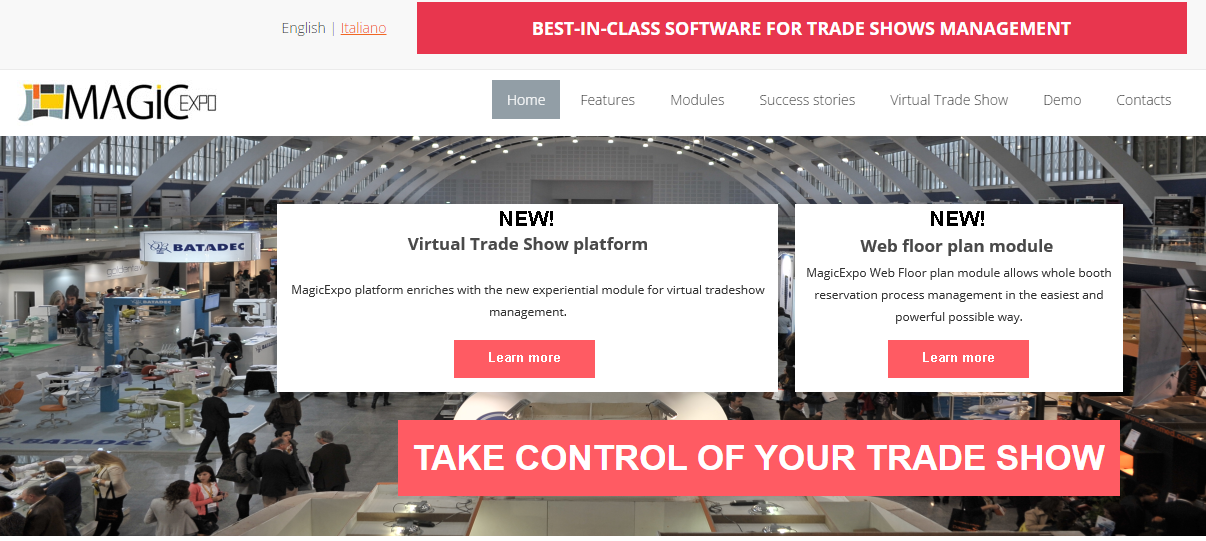 MagicExpo is the best-in-class trade show management platform providing all the tools you need for full-managing your trade show event. Each step of the trade show is fully managed. A complete identikit of every exhibitor and his history. Real-time budget and forecast monitoring. Perform direct email activities evaluating redemption. Easily edit your floor plan using powerful tools and CAD features. Easily collect data for each exhibitor and publish them on the official website. Connect with your customers online, manage booth requests, contracts, and all the services they need. Manage online your ticket office and other services. Manage invoices, payment deadlines, and other administrative aspects. A direct online dialogue between buyer and seller. Give your clients the chance to purchase tickets, services, and products. Reports management, KPI, and Excel extractions. Know if your customer is really satisfied.
