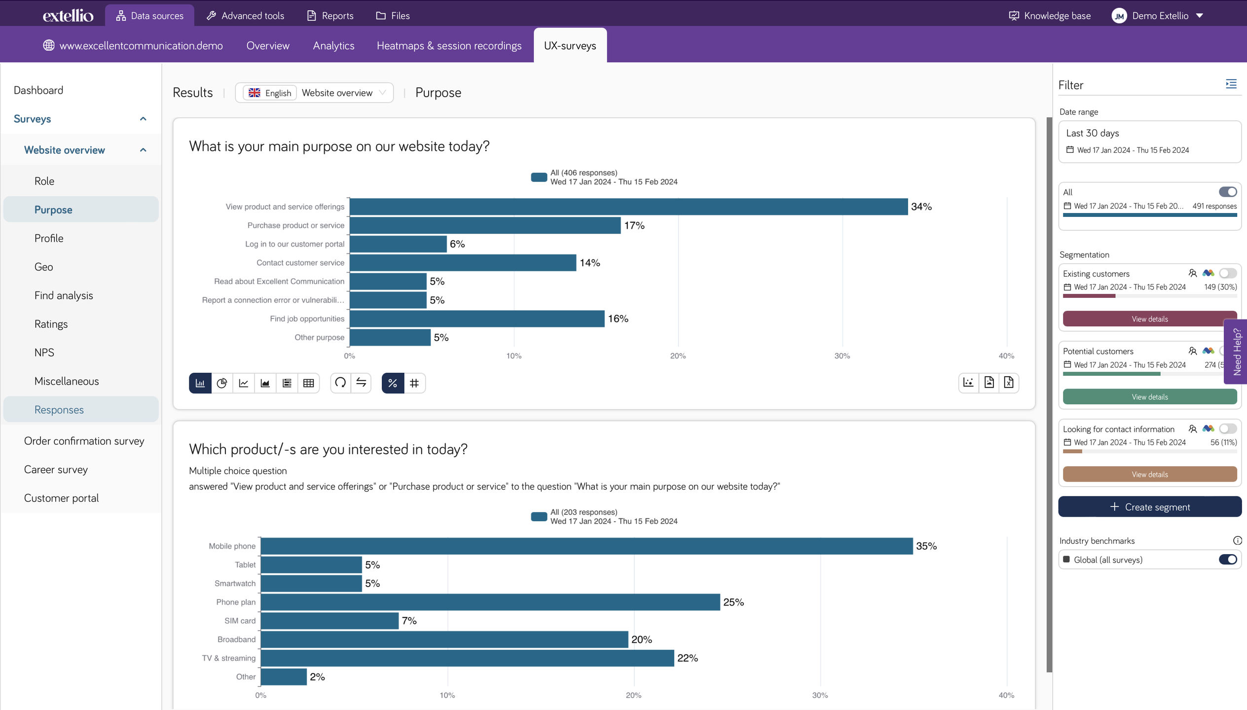 Extellio is built to understand all aspects of user journeys. It shows the behaviour, experience, conversion, expectations, and pain points for users for each of your target groups. This is achieved by combining web analytics, surveys, heatmaps and session recordings in one analysis platform that gives you meaningful insights you can act on with confidence to improve conversion and user experience.