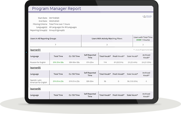 CL-150 Platform technology, learning materials, and instruction are tailormade to help US Government language programs keep pace with their changing needs. Start making a difference in days, not years. Optimize face-to-face time. Support acquisition with class management and content authoring tools that free up class time for engagement. Prevent proficiency fall-off after training. Seamlessly transition your personnel to sustainment with learning that's mission-relevant and reportable. Increase language proficiency to higher levels to meet more complex mission demands with remote enhancement, anytime, anywhere. Learners engage with level-appropriate, pedagogically-sound content to build and refresh the modalities, vocabulary, and grammar they need most. Instructors create and assign custom, online lessons, monitor student activity, and come to class assured their students are ready to engage.