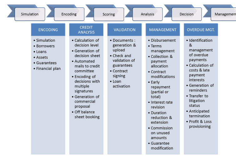 F2B Loans A comprehensive solution for all financing activities. F2B Loans is a web-based software solution managing the entire Front to Back loan acquisition and management process. It is a complete loan servicing platform that enables banks and financial institutions to offer the full set of loan functionalities in one single integrated and scalable solution. All types of private and professional loans are covered: Consumer loans, Installment loans, Mortgage loans, Investment credits, Commercial loans, Term advances, Revolving credits, Leasing. The entire loan lifecycle is covered. Each loan request has a global lifecycle than can be summarized as follows: Simulation, Encoding request, Scoring, Analysis & Decision, Document generation & signature, Back-office management. Each of these stages can be divided into sub-stages that can easily be parameterized in our F2B Loans solution.
