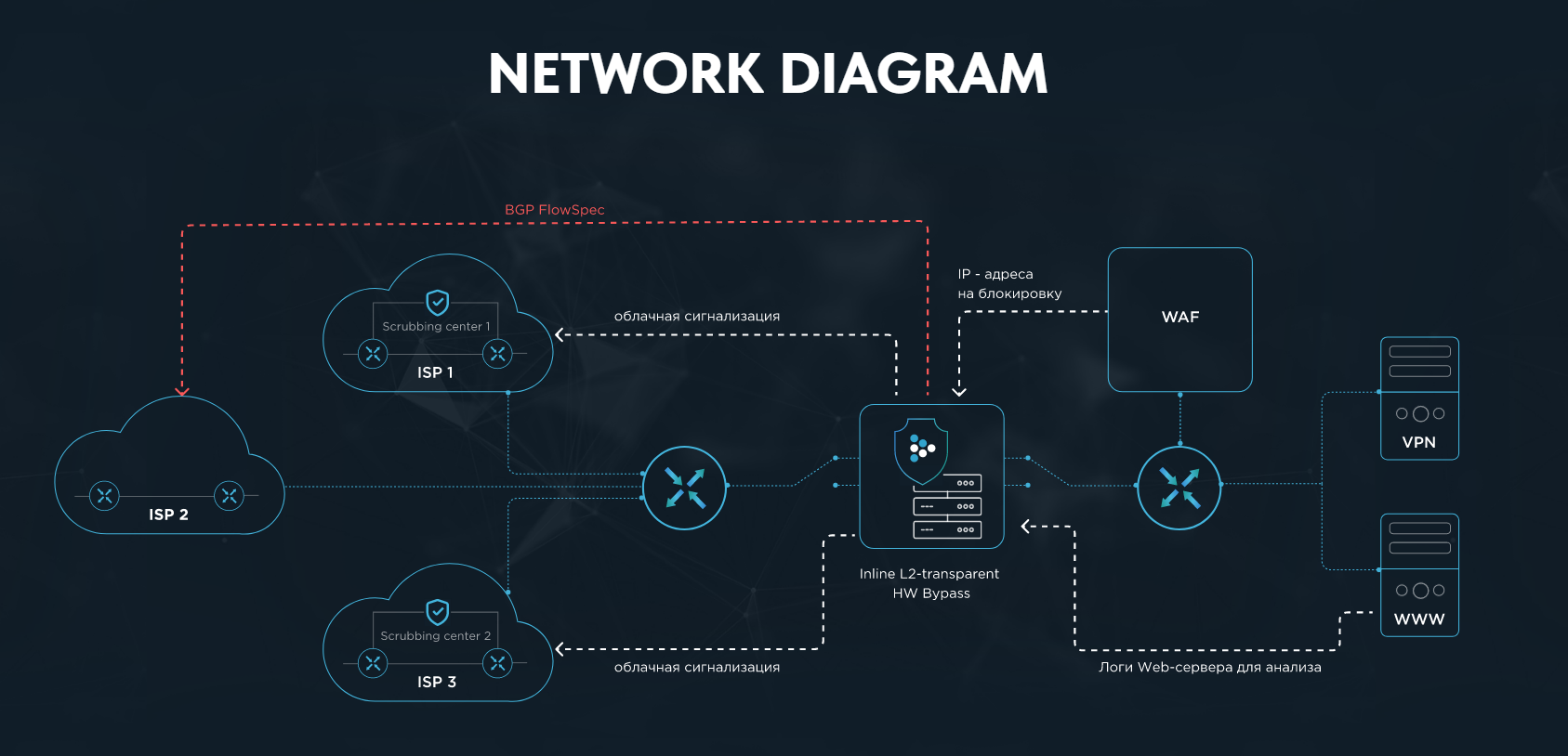 MITIGATOR is an instrument against modern DDoS attacks at L3-L7 layers. It is designed to secure infrastructure and individual services of financial and gaming companies, telecom operators, hostings and enterprise.