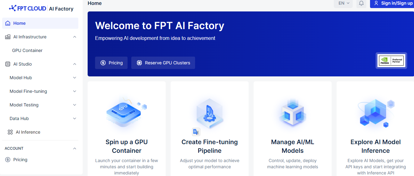 FPT AI Factory is a comprehensive, enterprise-grade AI development platform built on NVIDIA H100 and H200 superchips, offering a full-stack solution that spans the entire AI lifecycle, FPT AI Infrastructure delivers high-performance, scalable GPU resources for rapid model training; FPT AI Studio provides data hubs, AI notebooks, model pre‑training, fine‑tuning pipelines, and model hub for streamlined experimentation and development; FPT AI Inference offers production-ready model serving and “Model-as‑a‑Service” for real‑world applications with low latency and high throughput; and FPT AI Agents, a GenAI agent builder, enables the creation of adaptive, multilingual, multitasking conversational agents. Integrated with ready-to-deploy generative AI solutions and enterprise tools, FPT AI Factory empowers businesses to innovate quickly, deploy reliably, and scale AI workloads from proof-of-concept to operational systems.