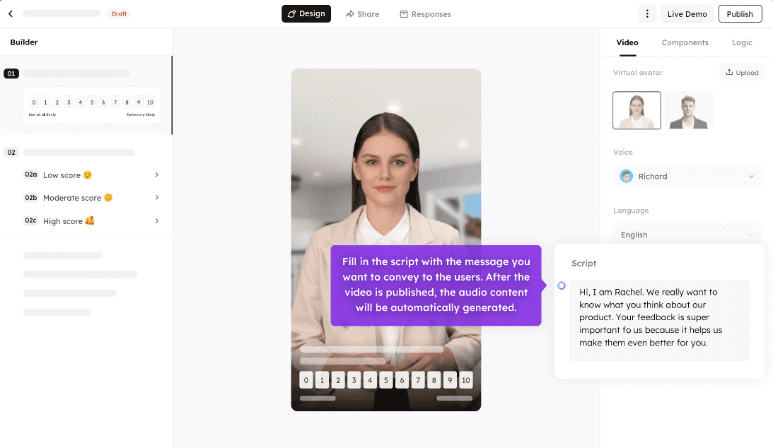 Feedeo is an AI-powered tool that creates interactive videos with real or cartoon characters in minutes. No need for expensive spokespersons - lifelike avatars create a professional and engaging effect on your website, social media, and EDM.